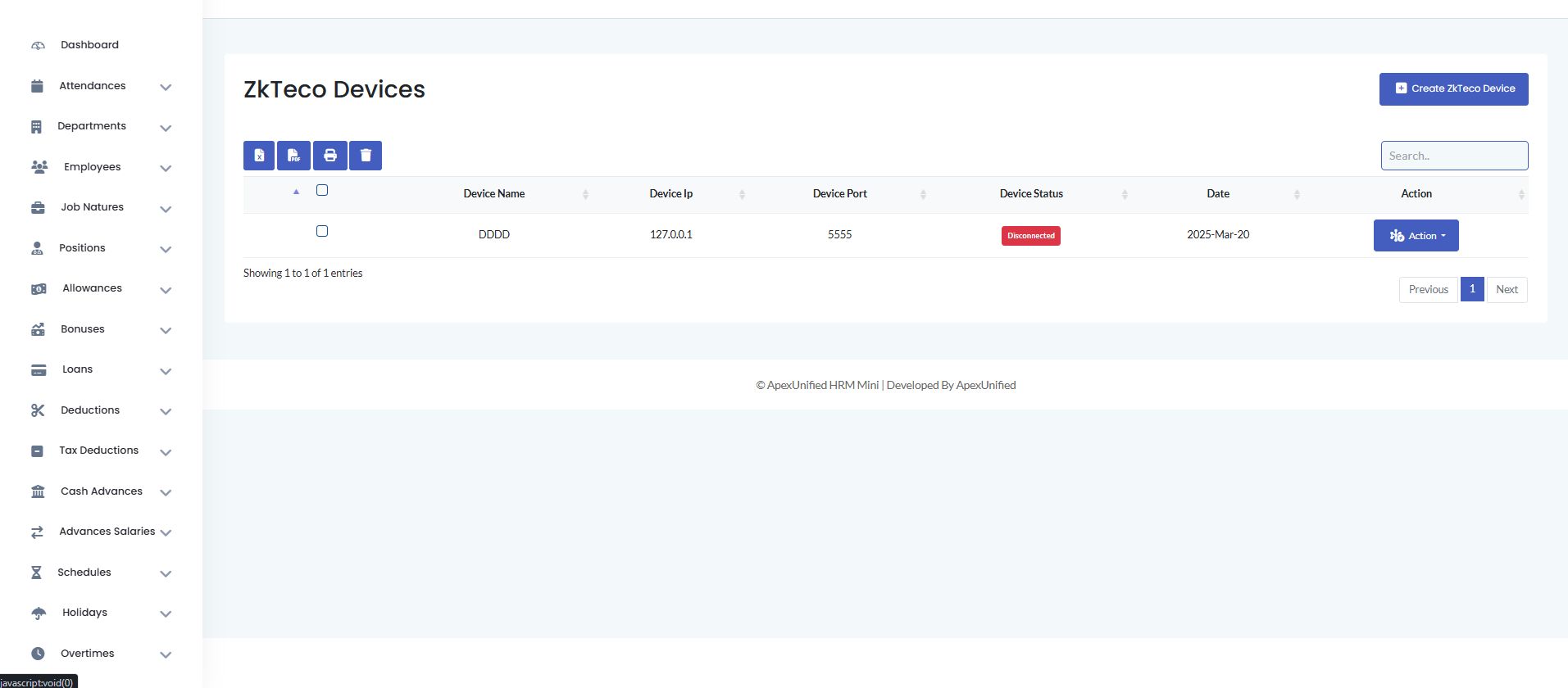 We developed a complete HRM Management System using Laravel 11 and Bootstrap 5, seamlessly integrated with ZKTeco devices for automatic attendance syncing and device management.